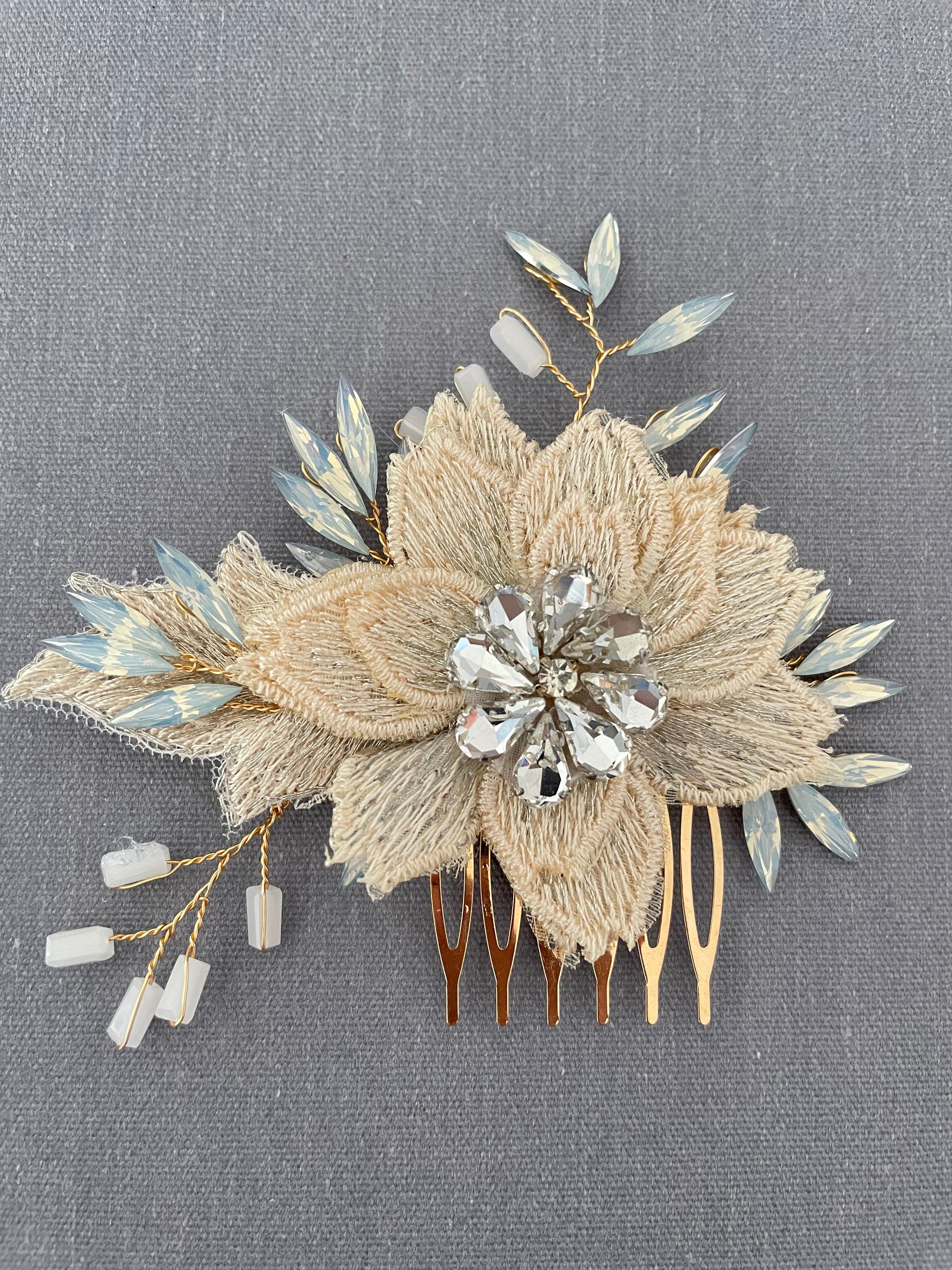 Layered threadwork florals create texture and depth, while opal crystal leaves and delicate gold wiring extend outward in an organic, botanical silhouette. The champagne palette offers a warm alternative to traditional ivory, pairing beautifully with ivory, cream, champagne, or gold-toned gowns.