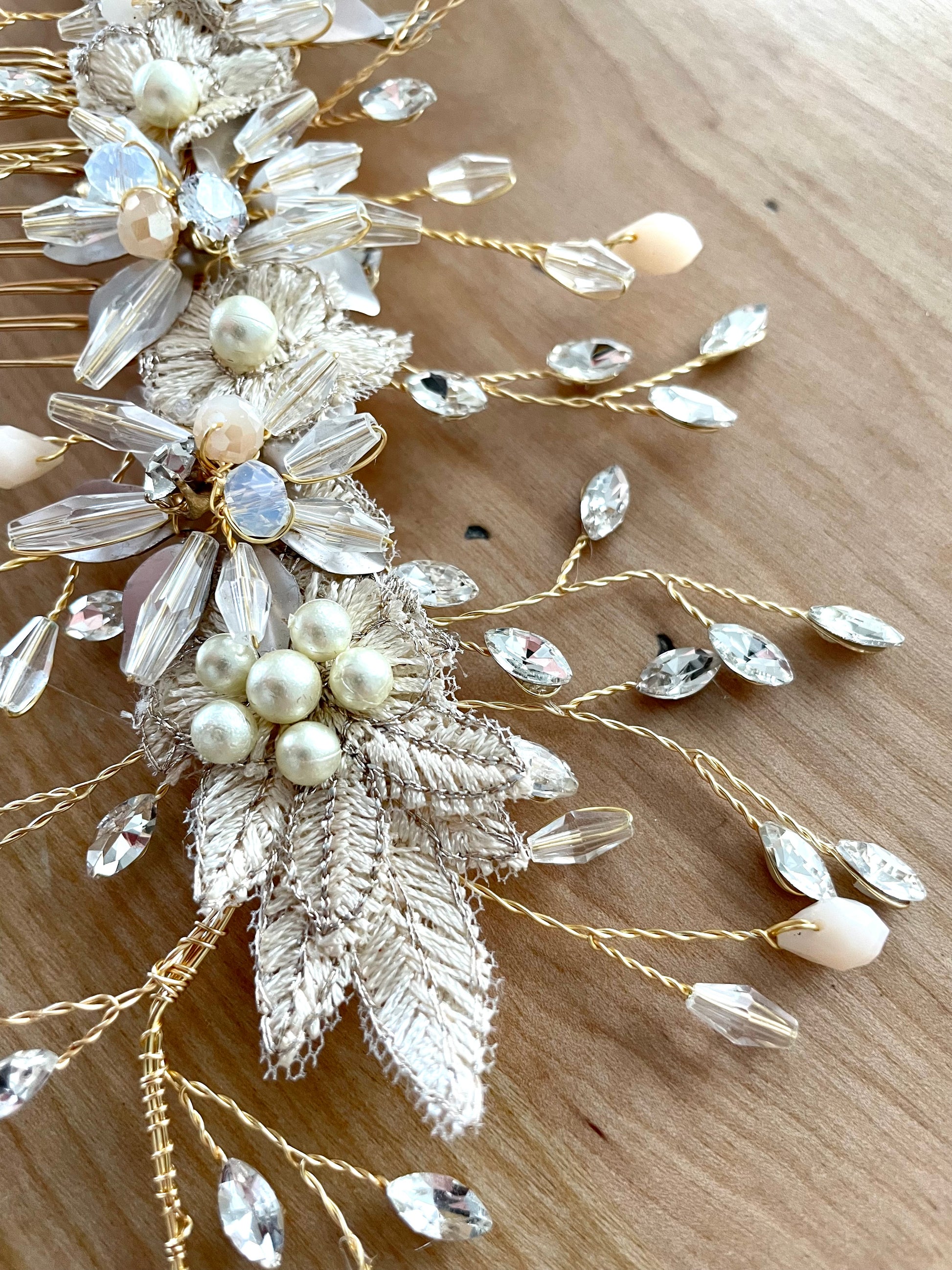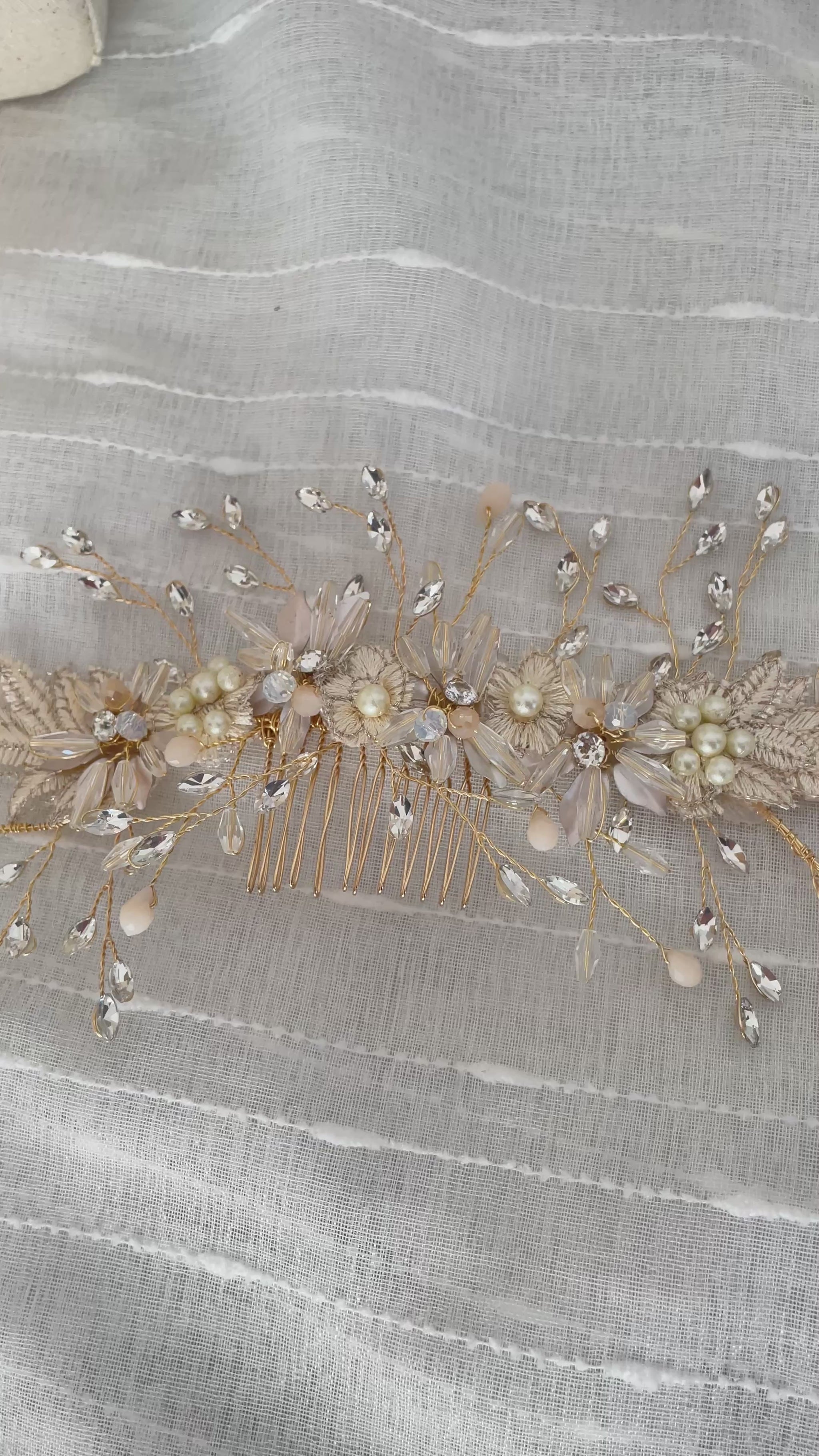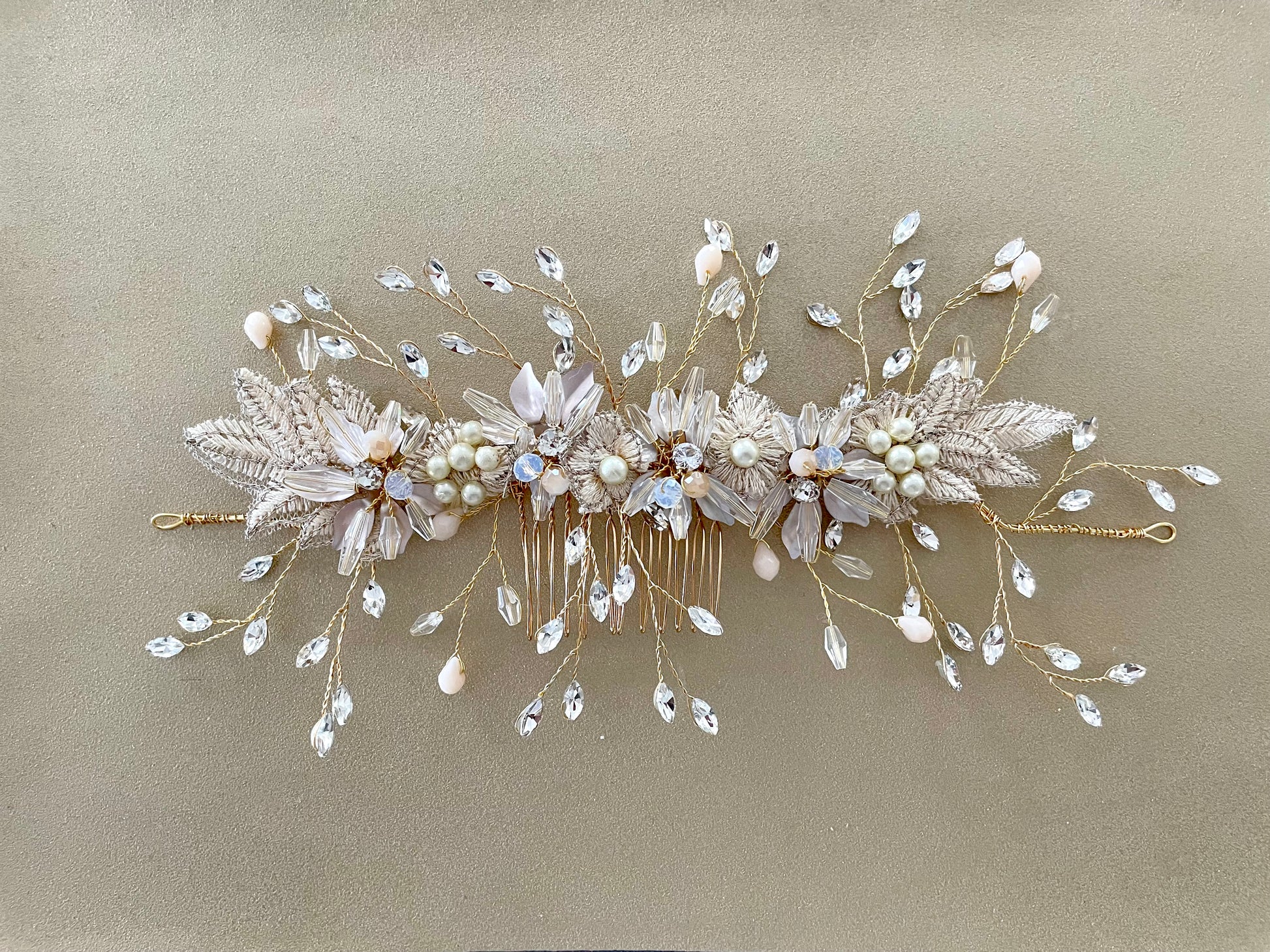 A stunning bridal comb created with layers of crystals, pearls, opalesque beads and soft applique flowers and leaves all set with golden tone wire with loops on each end and a comb to attach to hair.