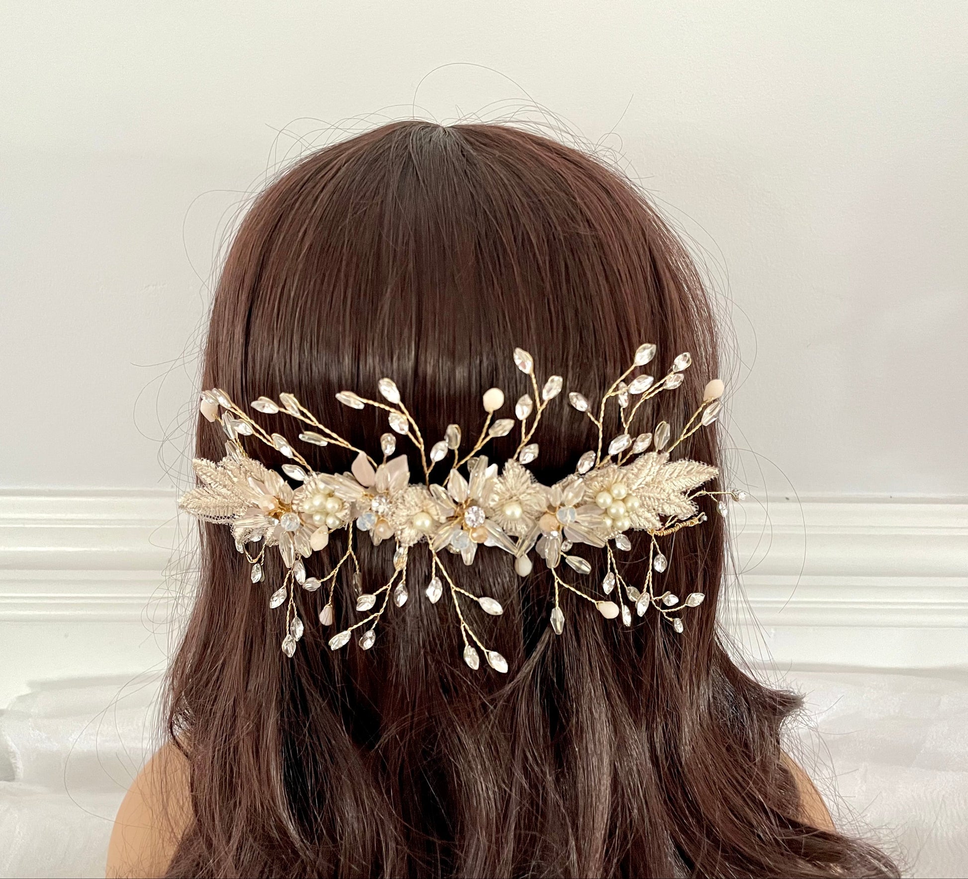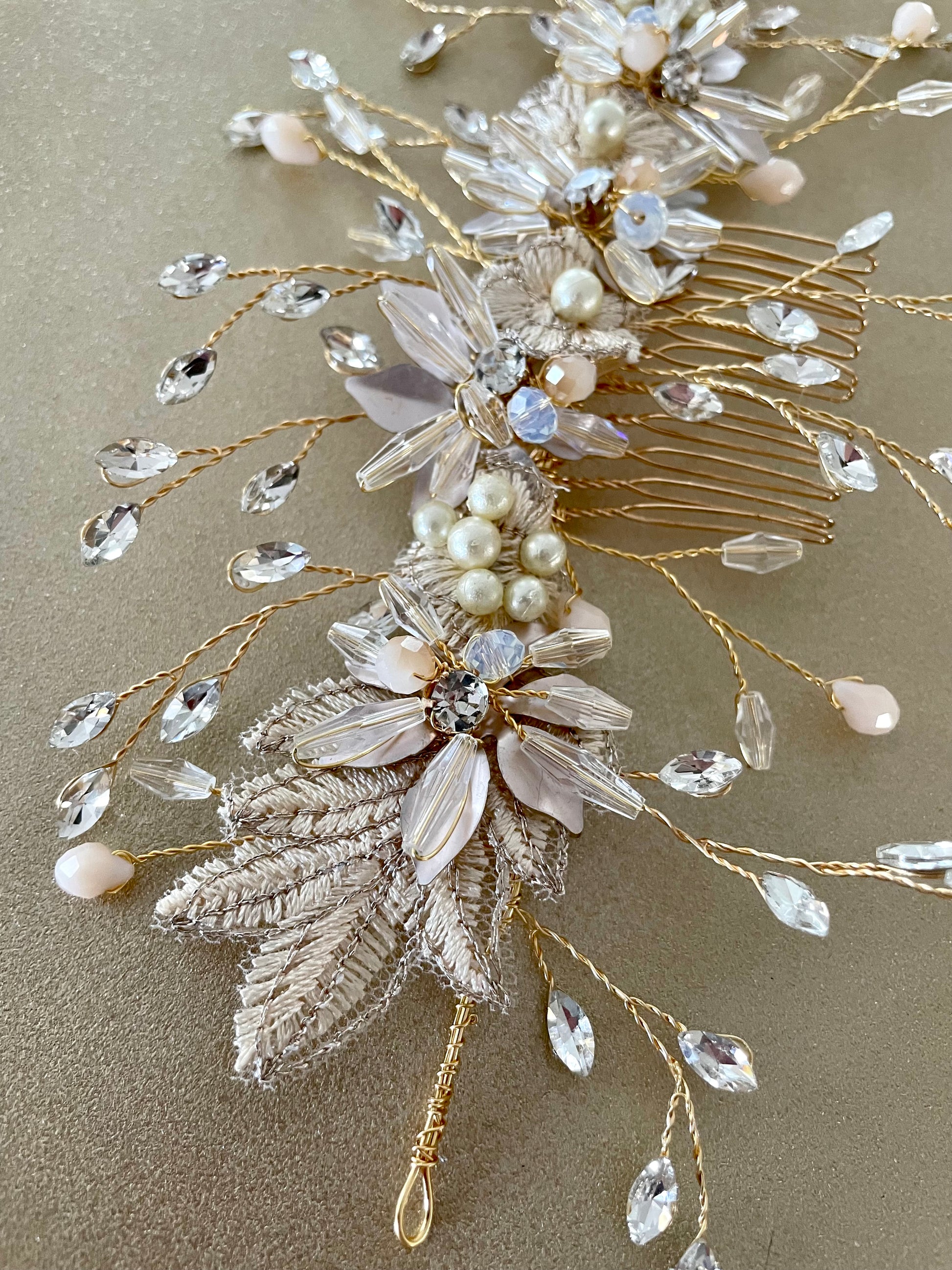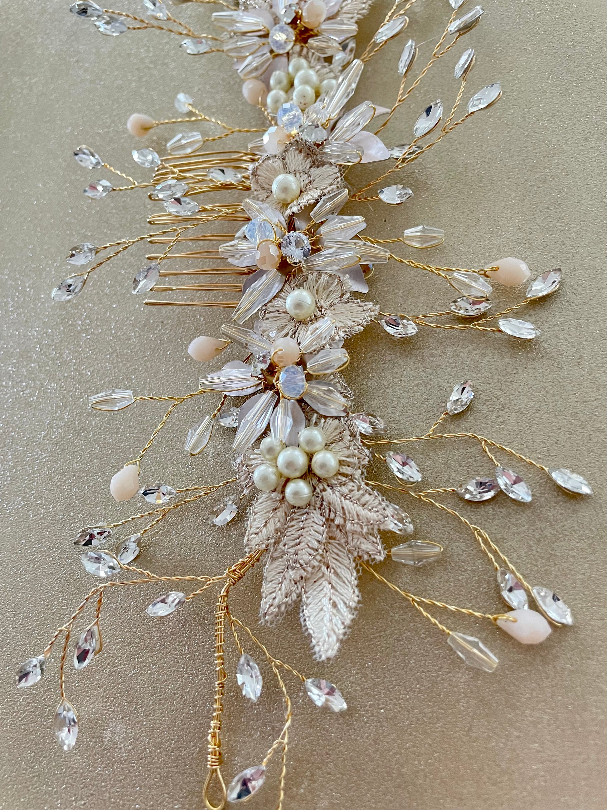 A stunning bridal comb created with layers of crystals, pearls, opalesque beads and soft applique flowers and leaves all set with golden tone wire with loops on each end and a comb to attach to hair.
