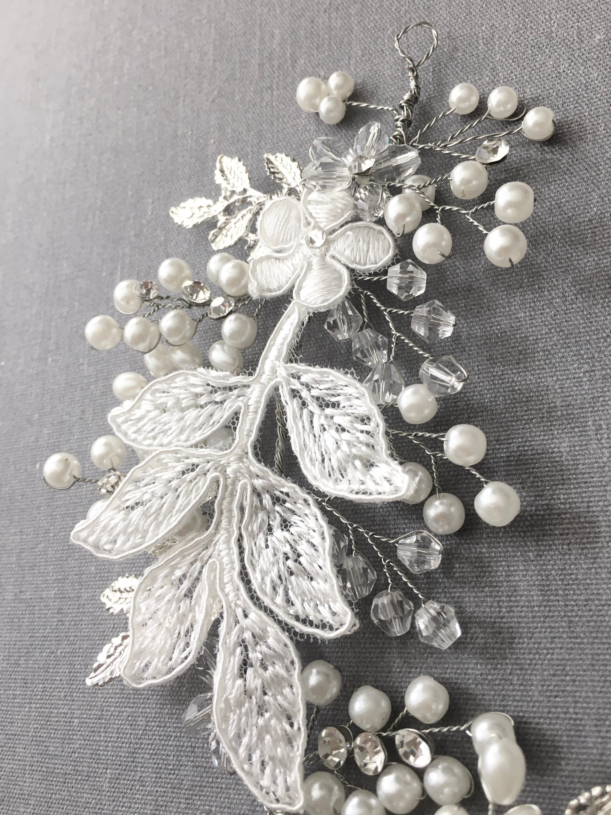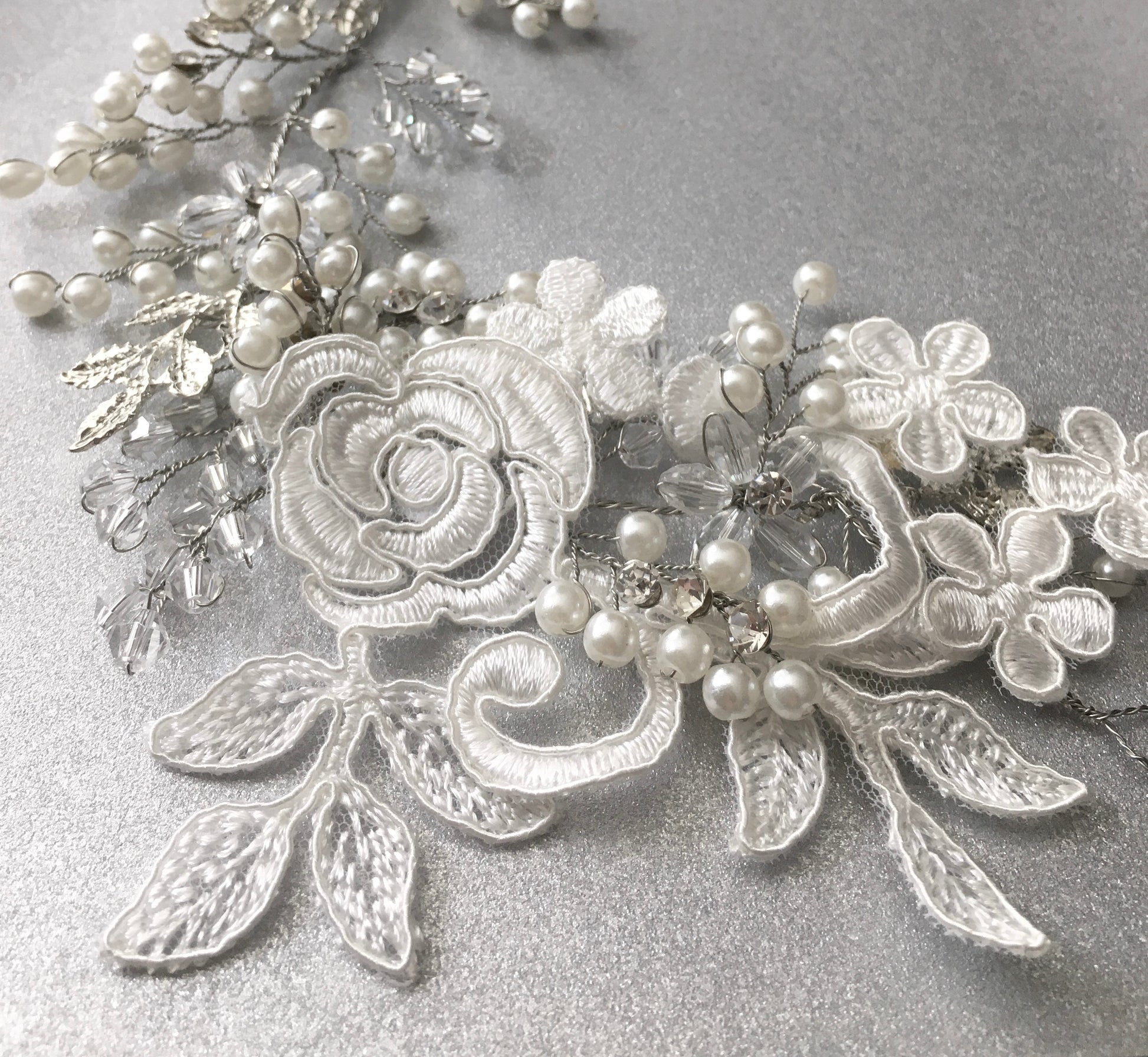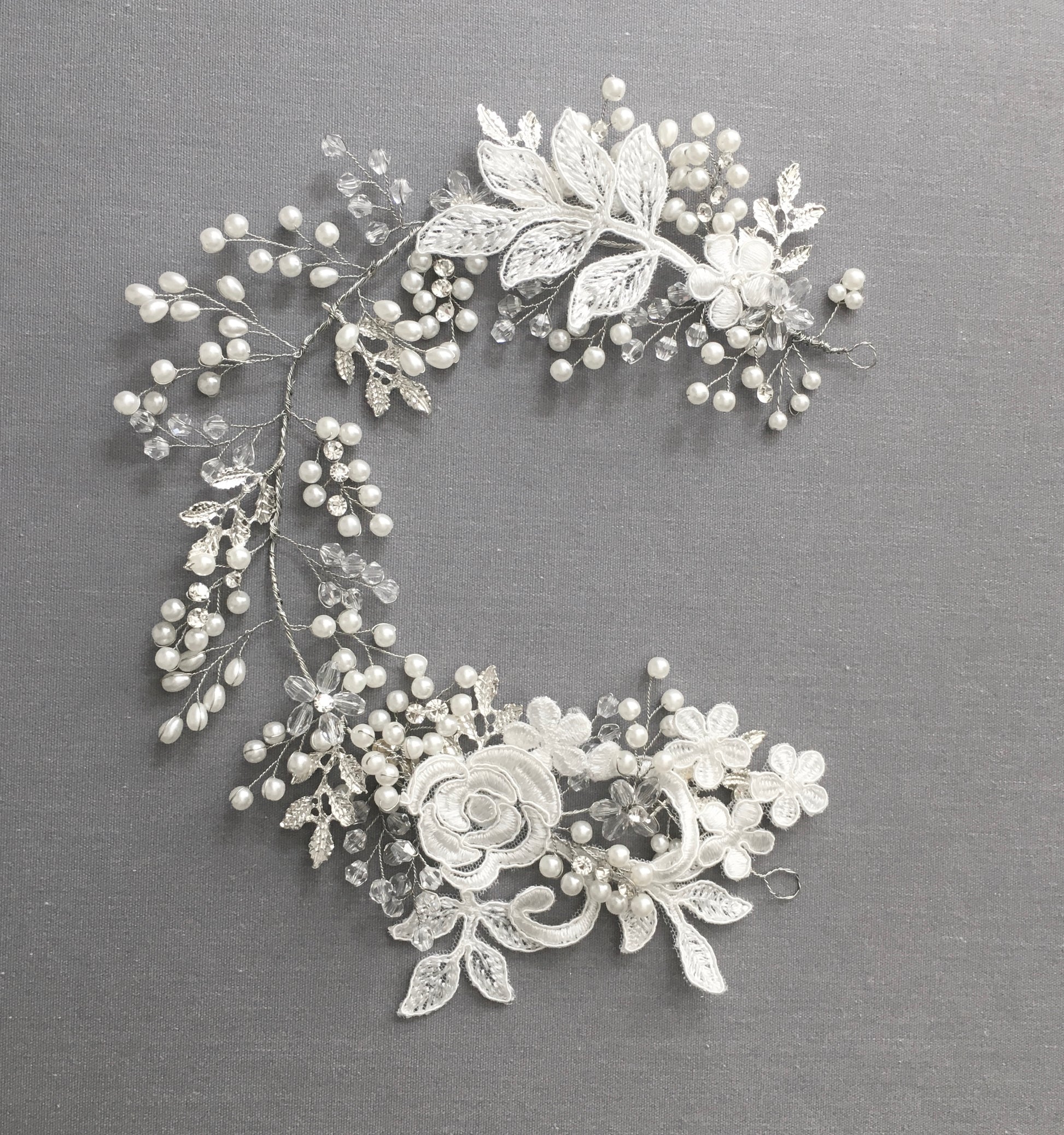 Cali Bloom Floral Head Vine features lace flowers, soft pearls, and crystal accents arranged on a flexible wire design. Lightweight and versatile, for effortless styling and a comfortable fit.