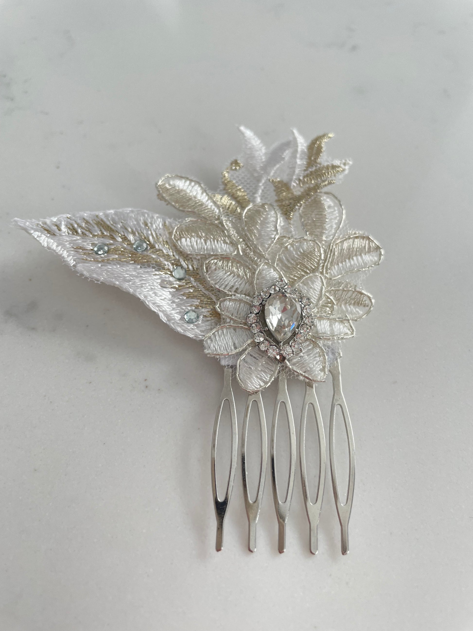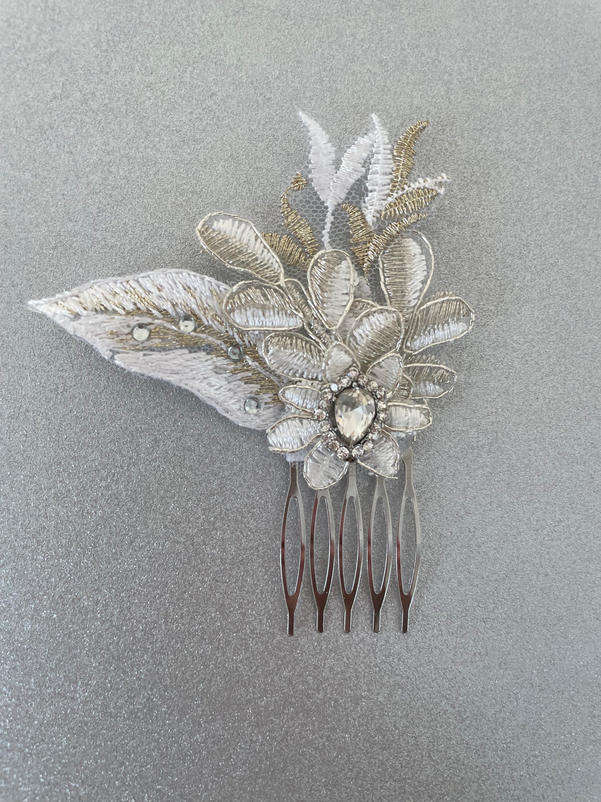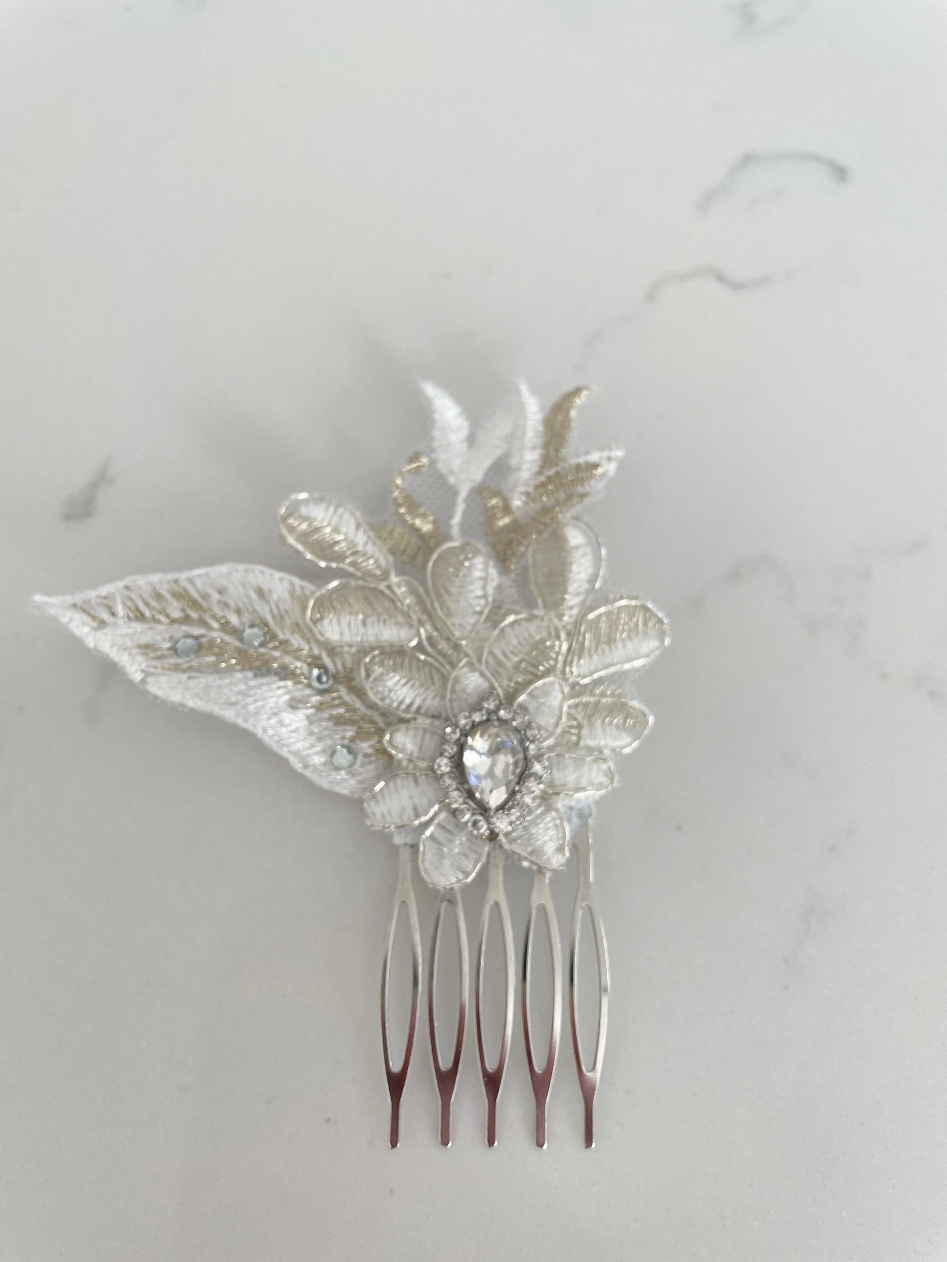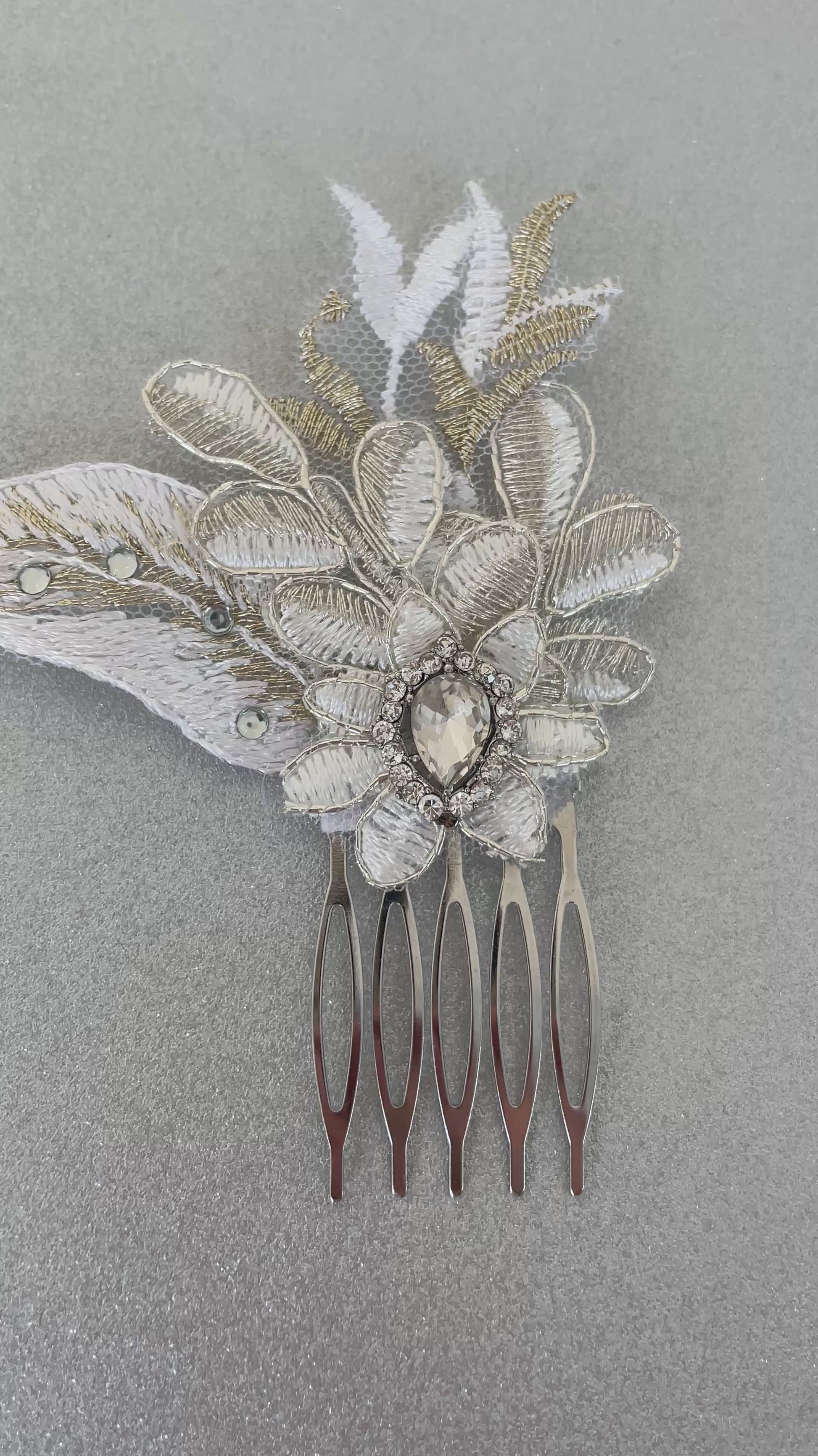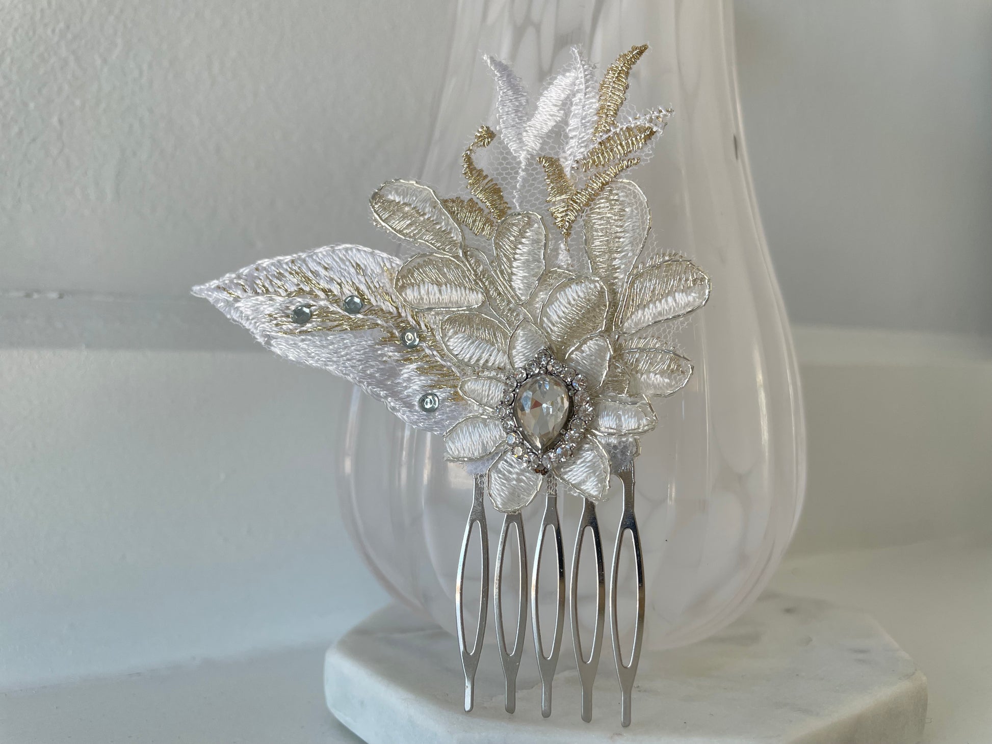 Designed for modern bridal styling, this comb complements sleek chignons, structured updos, and minimalist gowns seeking organic texture with a couture edge.