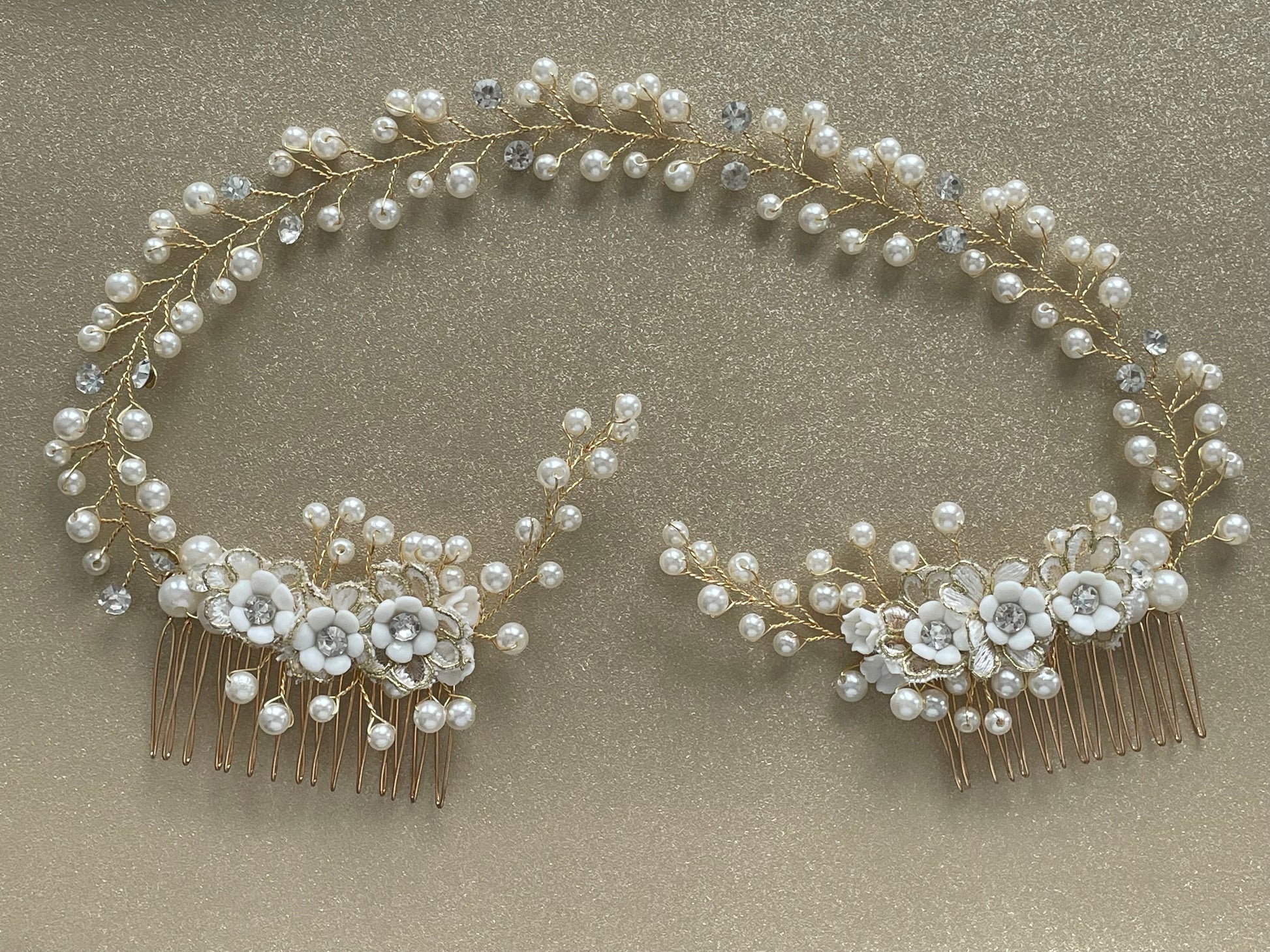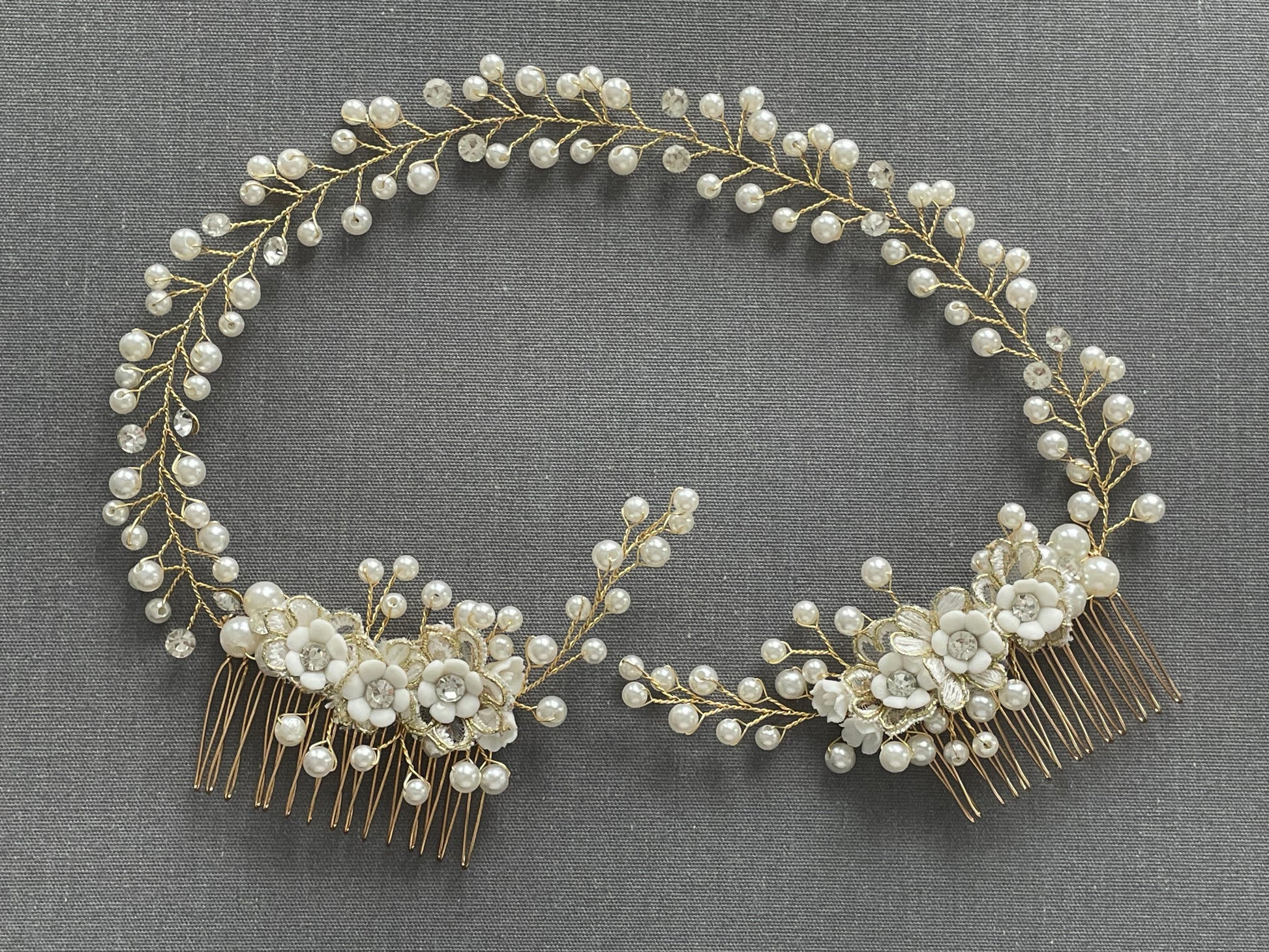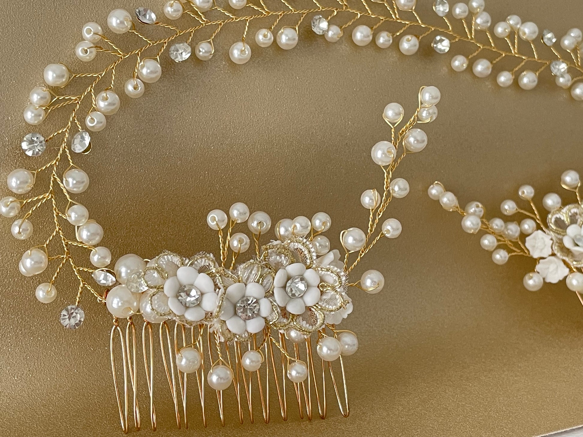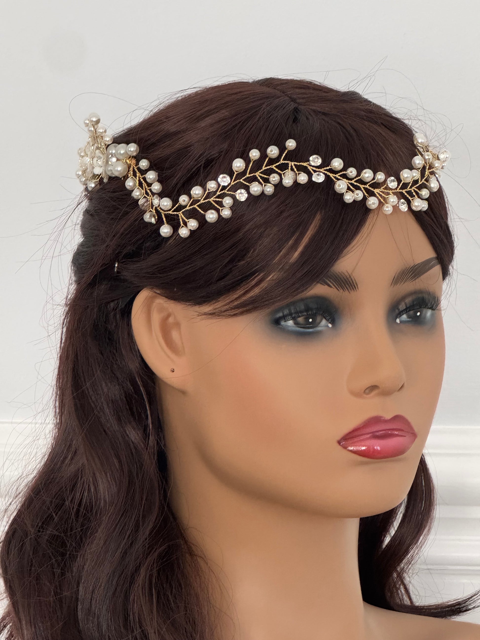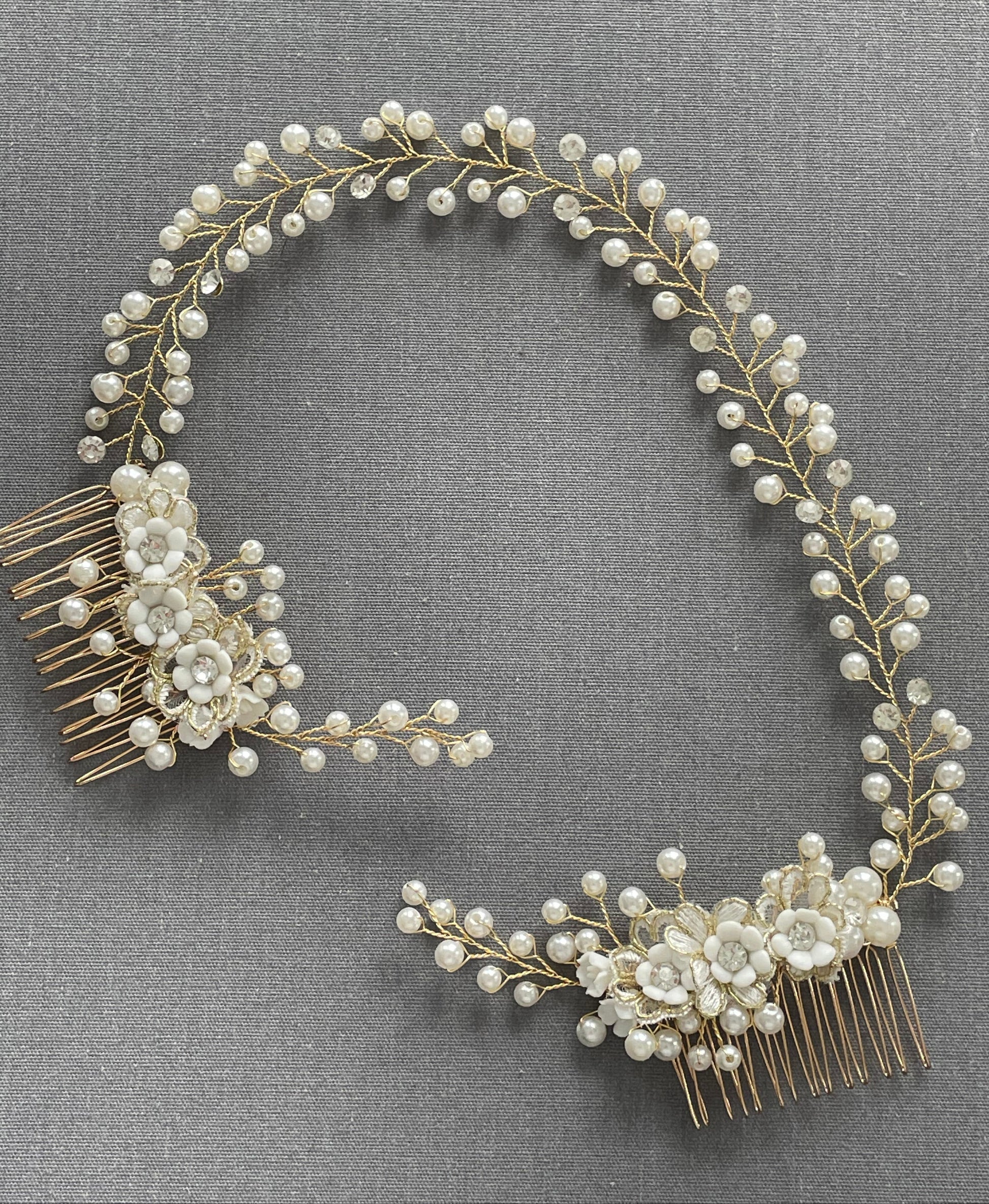 The Colette Double Comb Golden Bridal Hair Vine features delicate gold wiring adorned with luminous pearls and subtle crystal accents, Colette curves gracefully along the head, creating a romantic halo effect. Two floral comb anchors on each end provide secure placement while allowing flexible styling across low buns, half-up styles, or softly swept bridal waves. The dimensional pearl clusters and intricate floral detailing give this piece a refined, heirloom-inspired look.