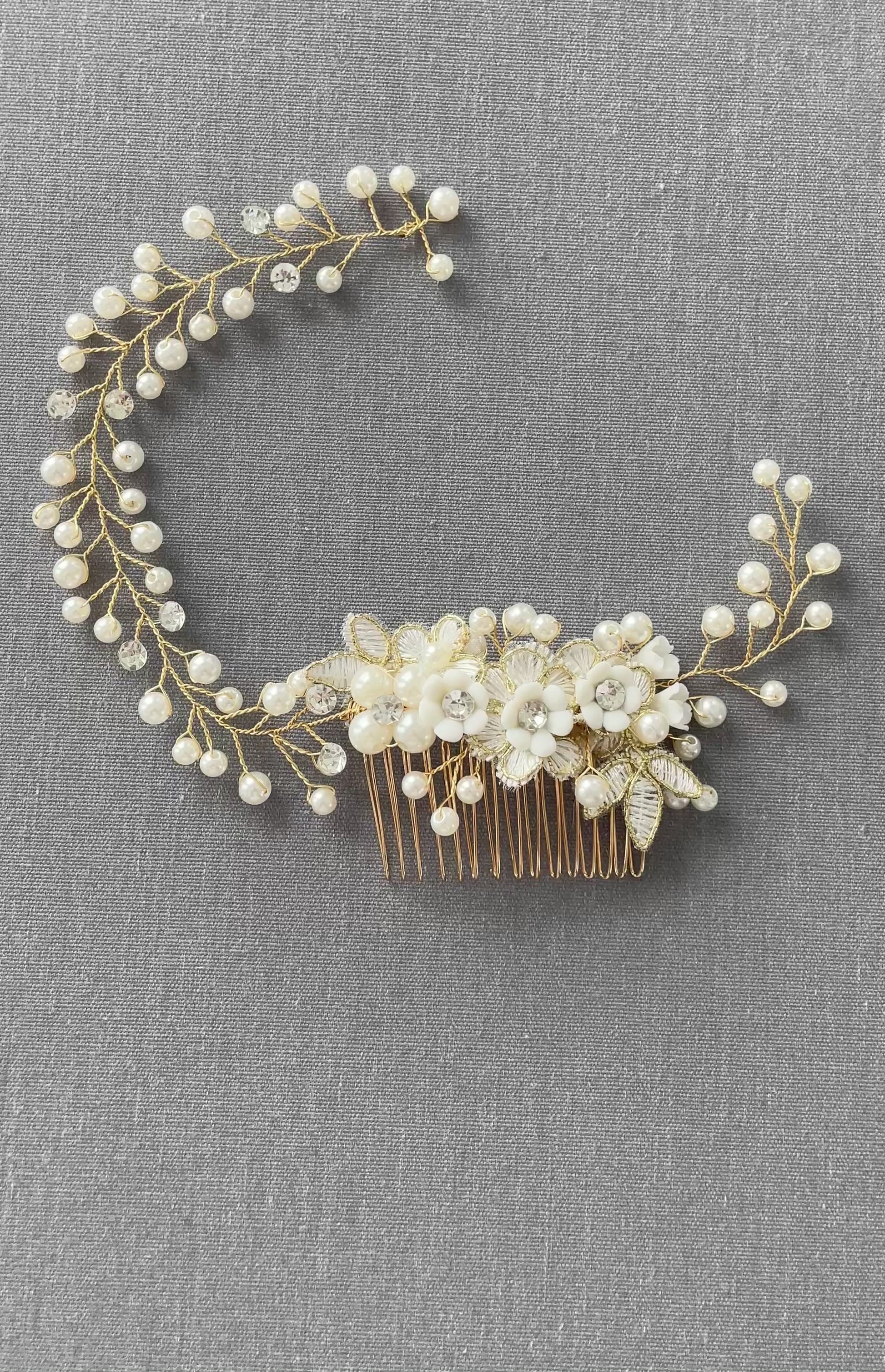 Delicate gold wiring branches anchored from the left side of the comb, creating a flowing vine silhouette adorned with luminous pearl clusters, embroidered florals, and subtle crystal accents. The asymmetrical structure is ideal for side-swept styles, low buns, and romantic waves where directional placement enhances the overall hairstyle.