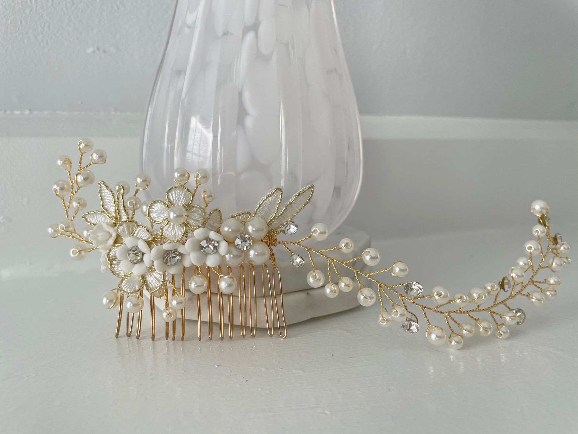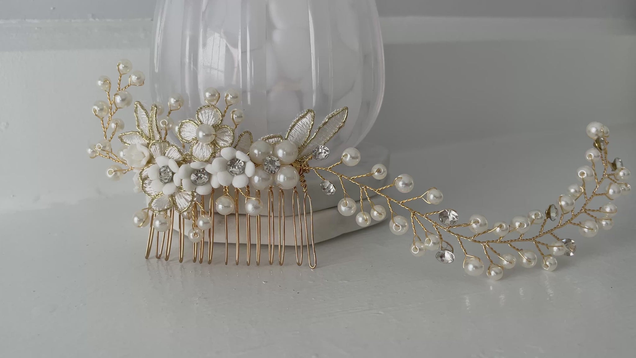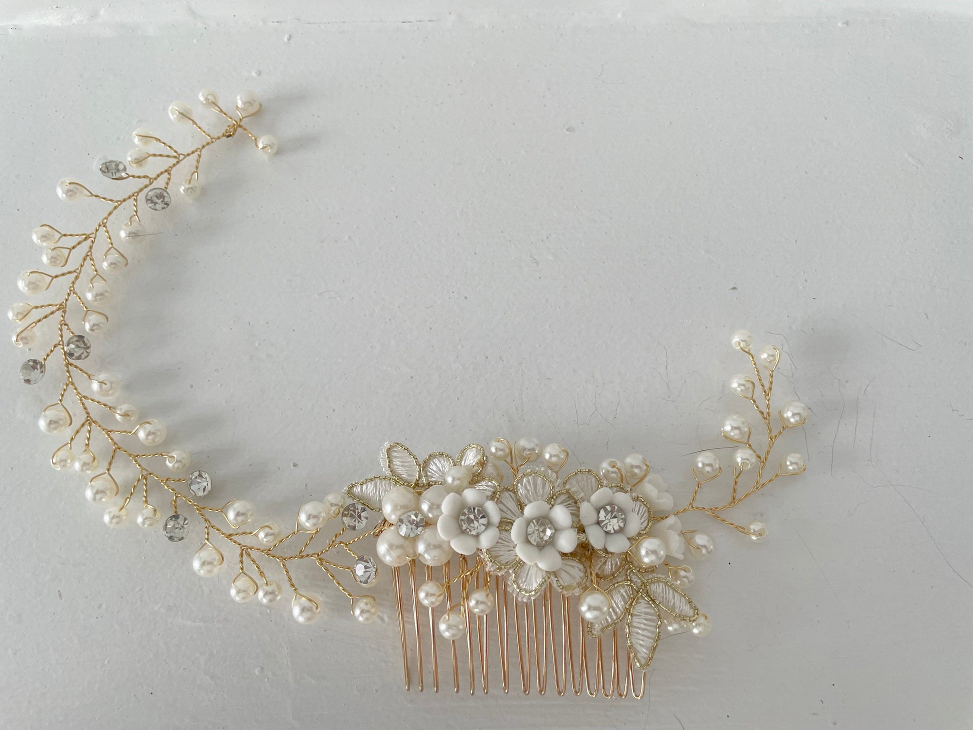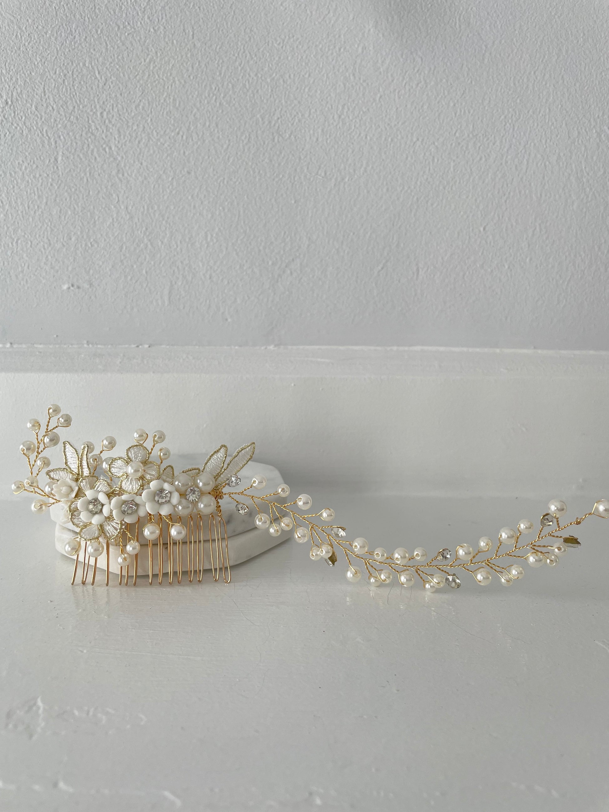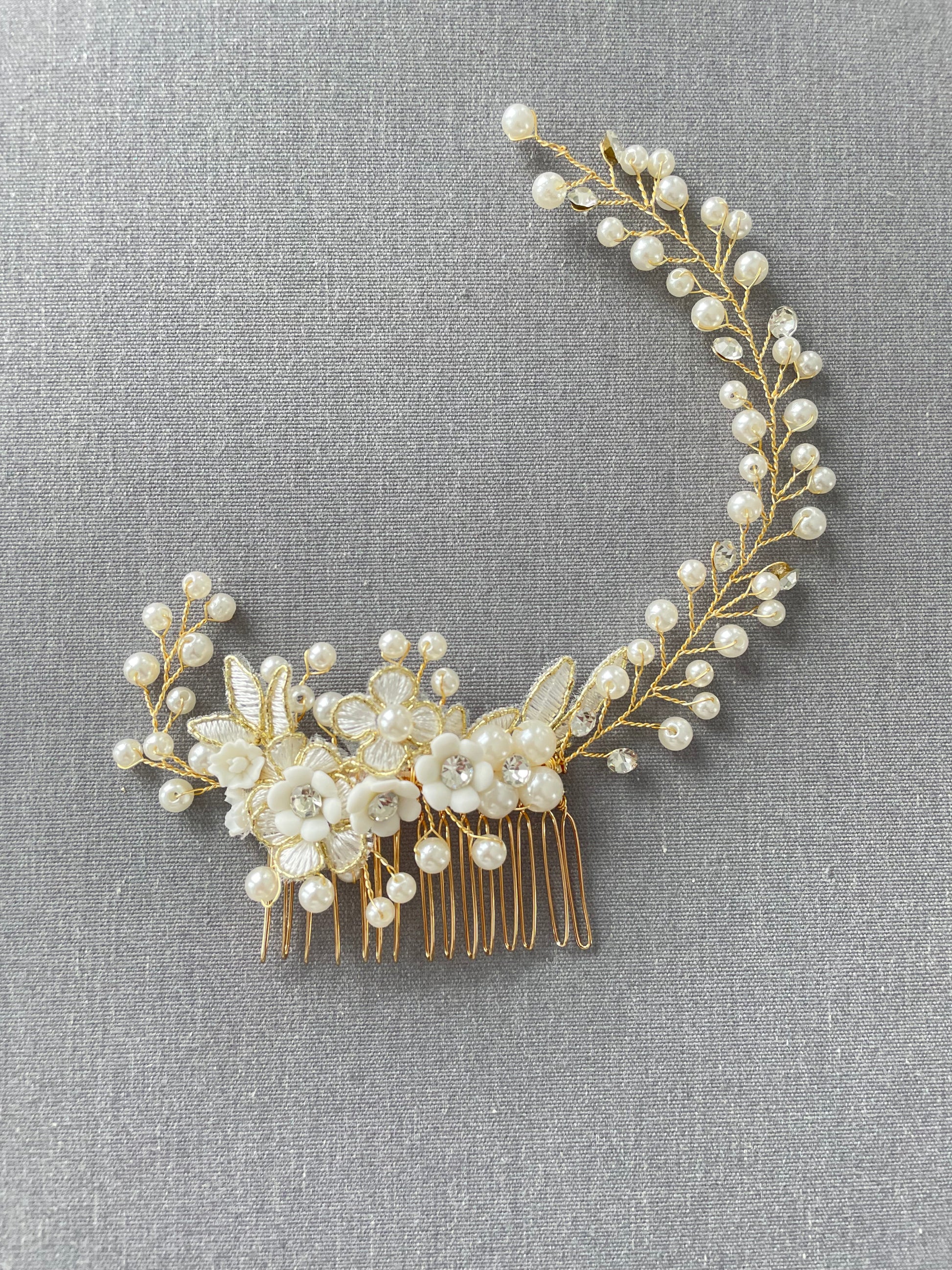 Part of the Colette Collection, this Single Comb Golden Bridal Hair Vine offers the same romantic pearl and crystal detailing as the signature double comb design — reimagined with a single comb and vine, anchored to the right, for softer, asymmetrical styling. The dimensional floral center features embroidered petals, pearl accents, and soft shimmer for a refined heirloom aesthetic.