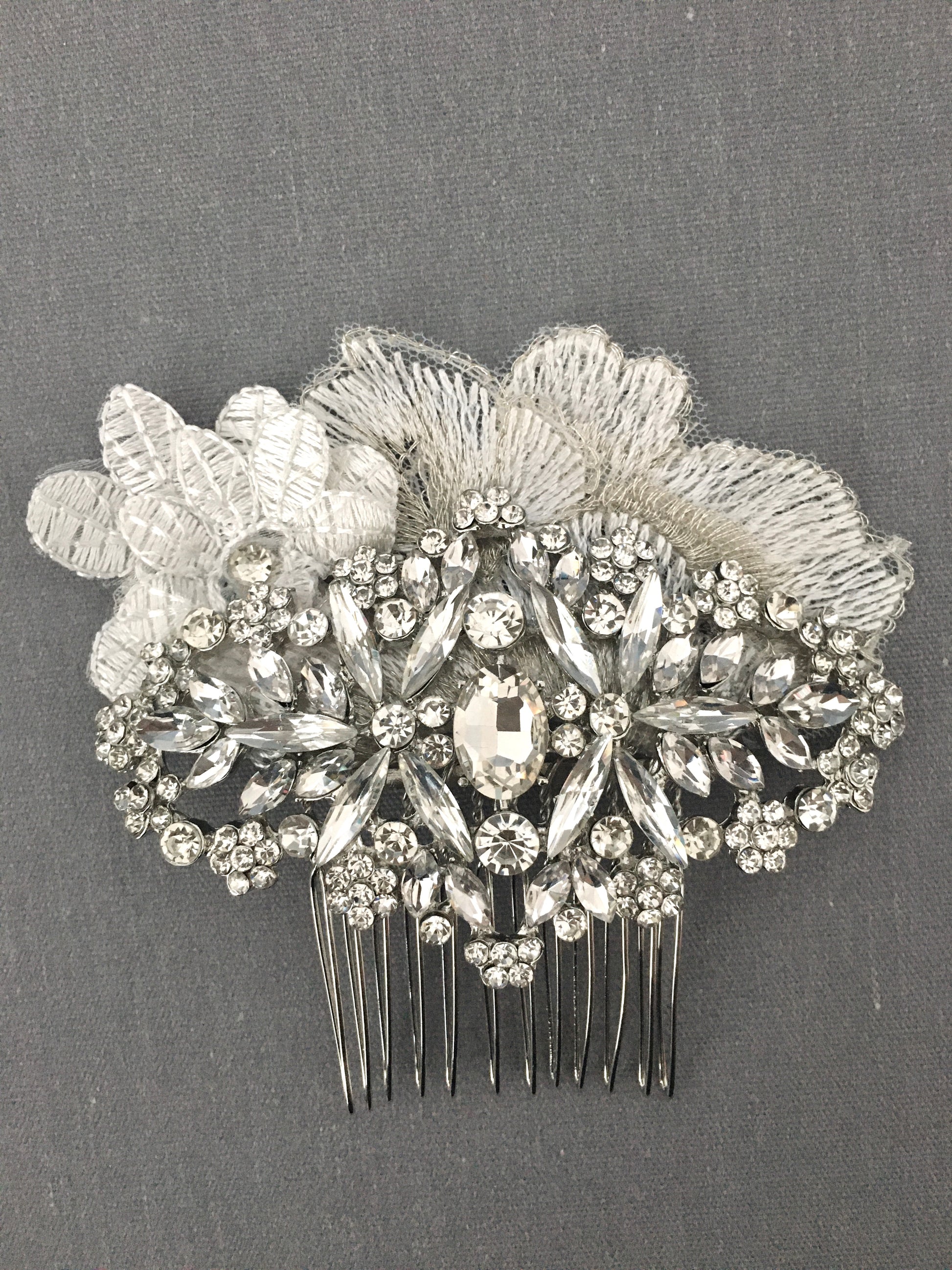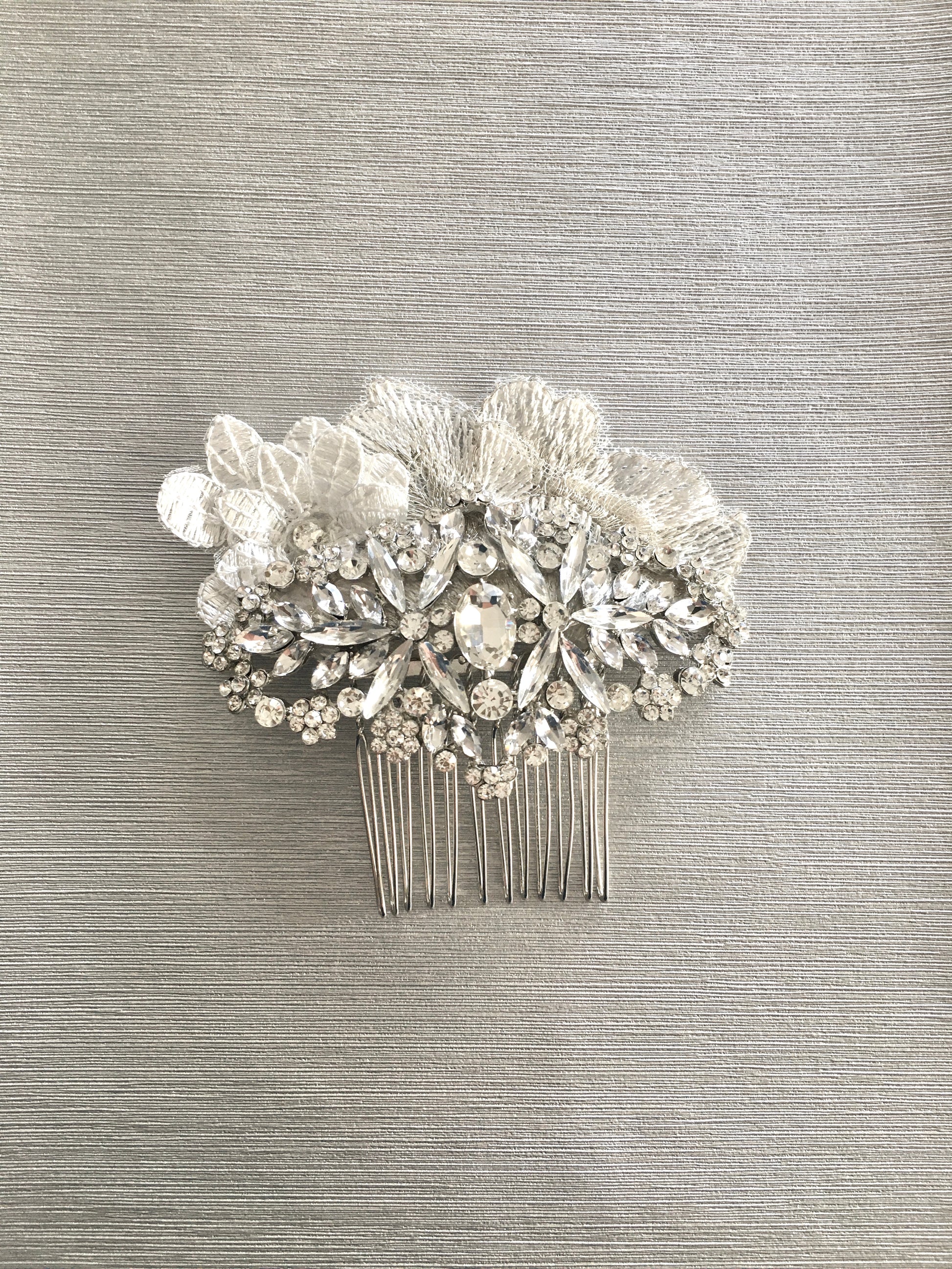 The Crystal Blooms Bridal Hair Comb features radiant marquise and round-cut crystals arranged in elegant floral designs, accented with delicate embroidered lace petals for soft texture and dimension. Perfect for wedding updos, half-up styles, or romantic loose waves.