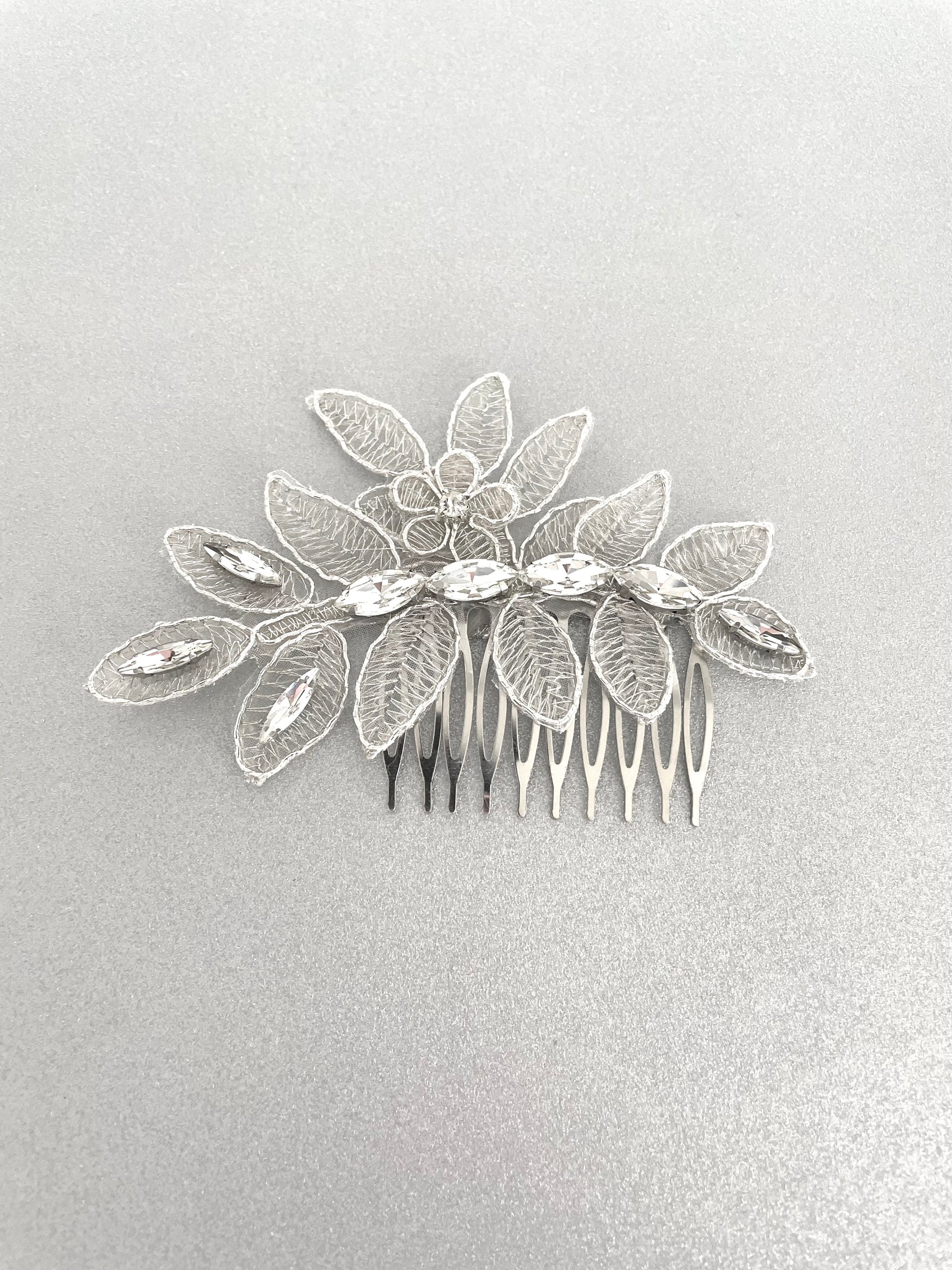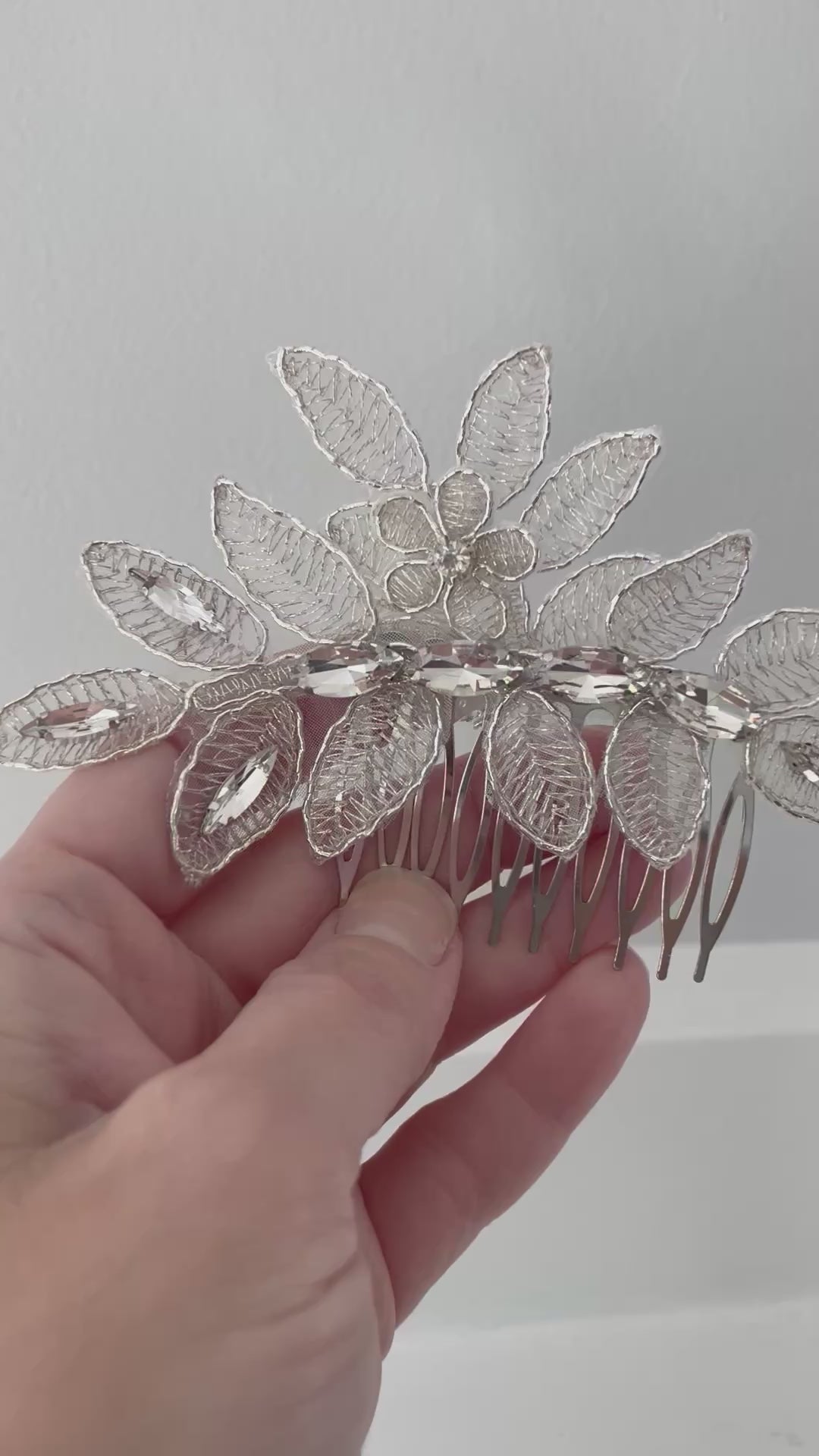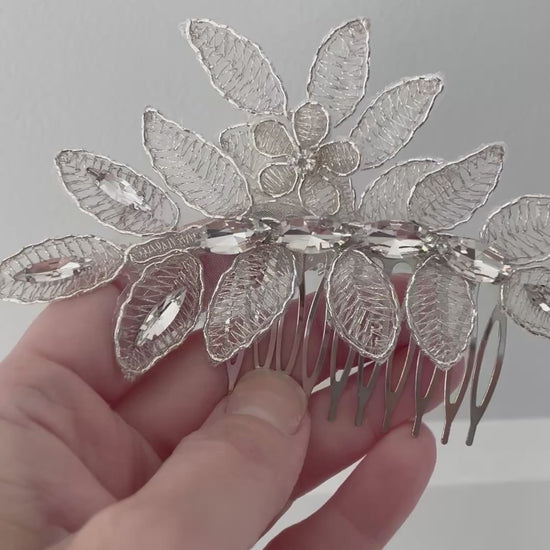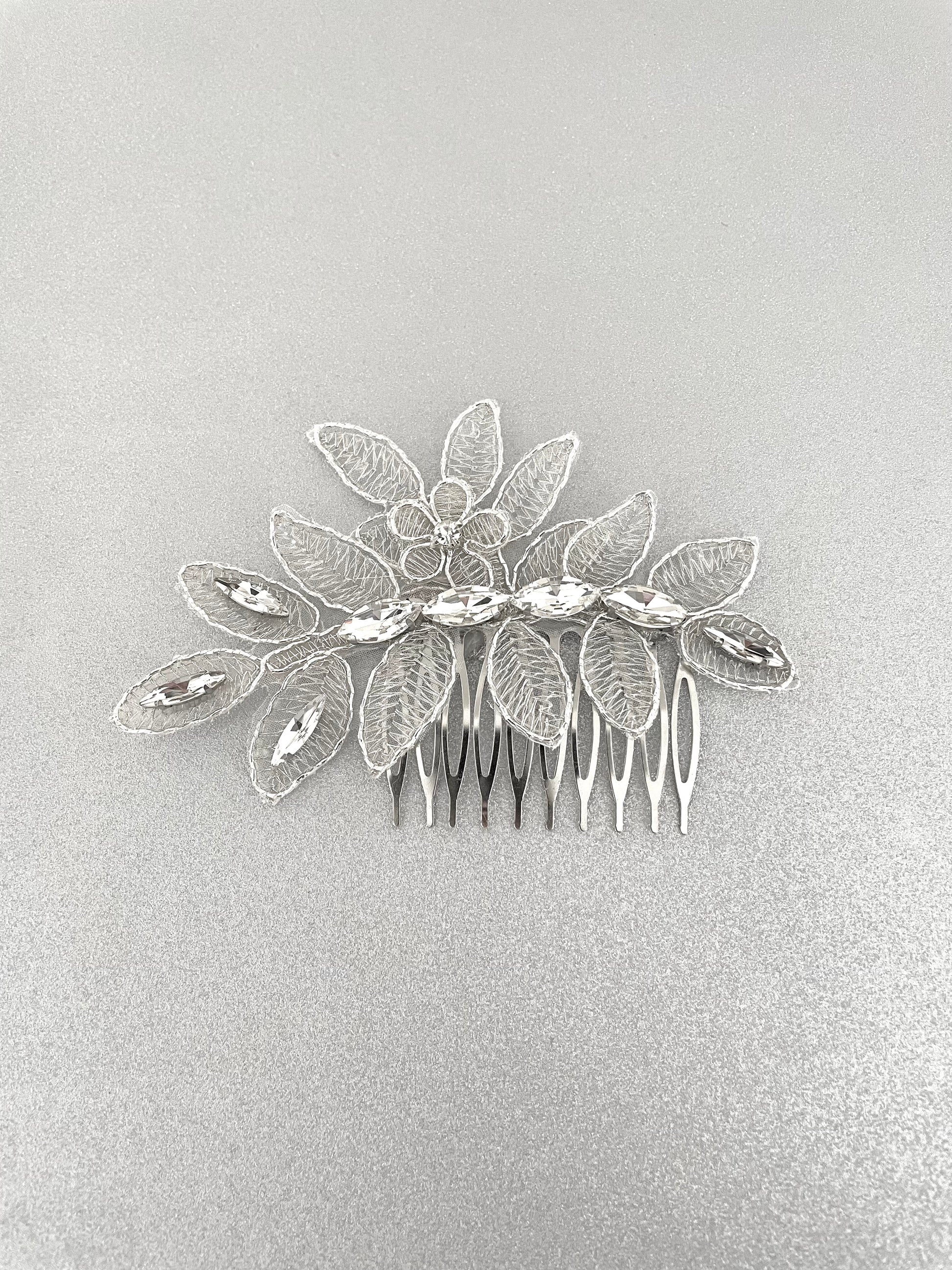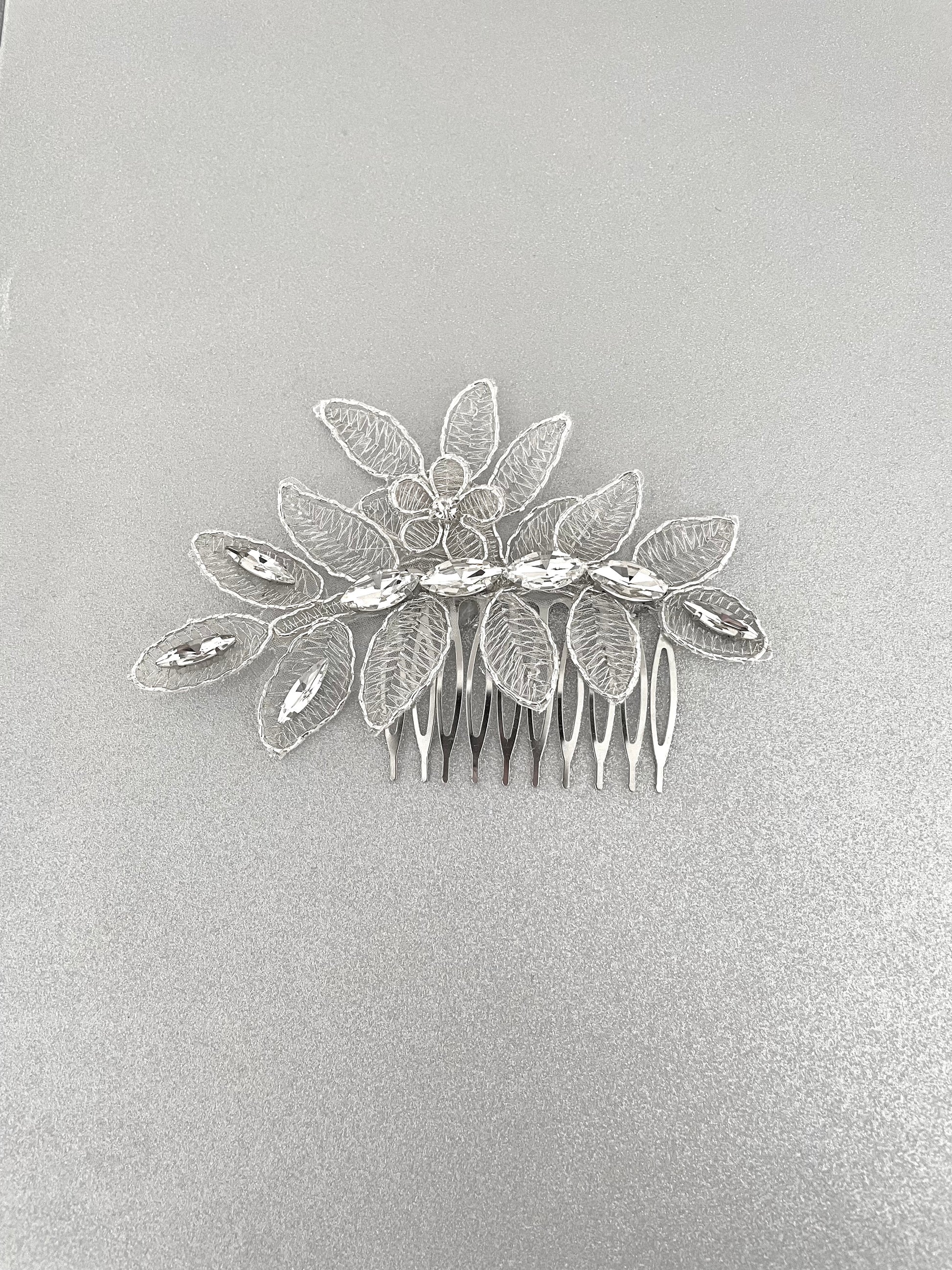 The Crystal Rue Bridal Hair Comb showcases delicate silver leafwork and faceted crystals, offering a timeless yet modern accent for brides, bridesmaids, or formal events. Perfect for brides seeking a modern, botanical-inspired bridal hair accessory.