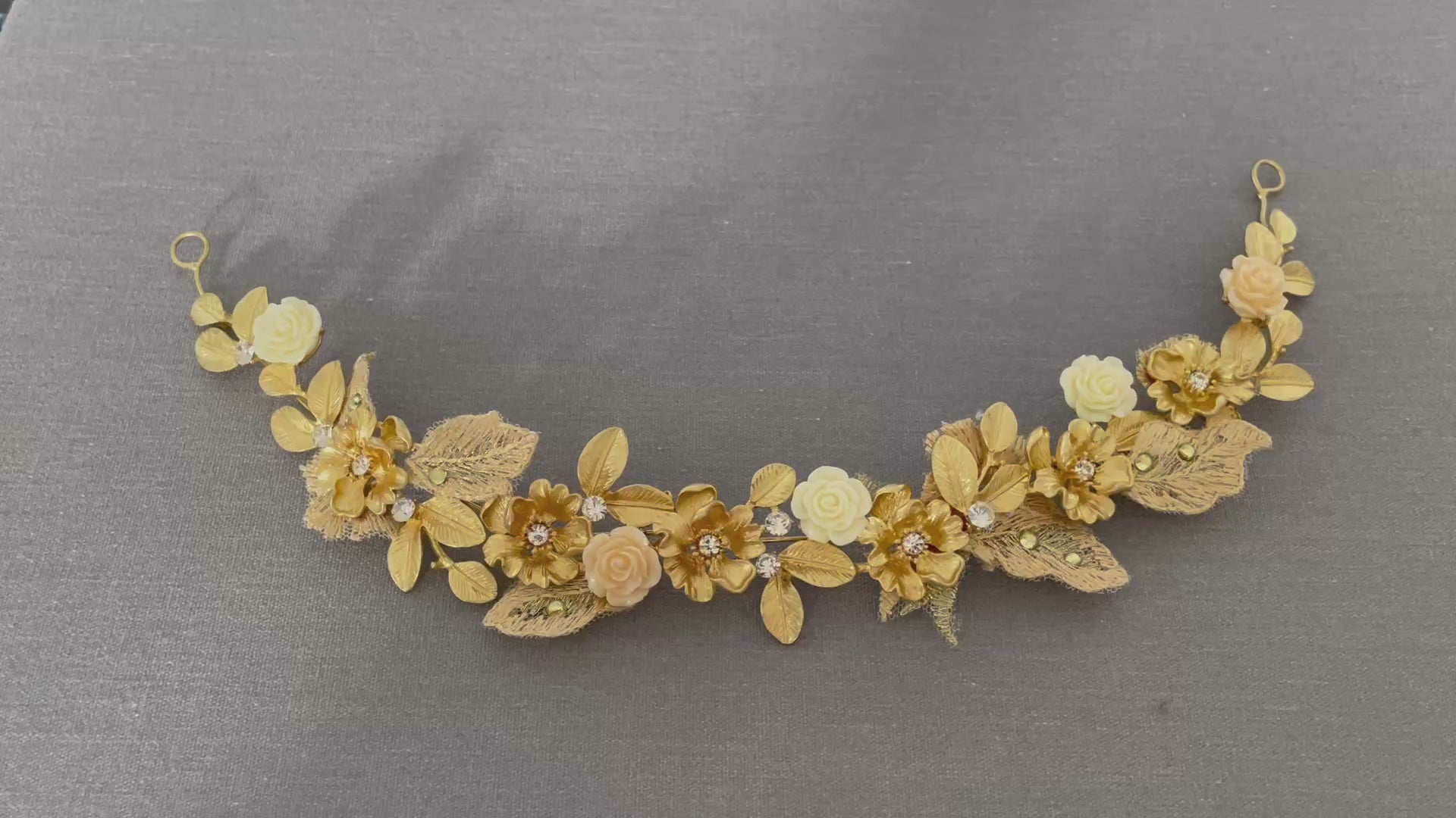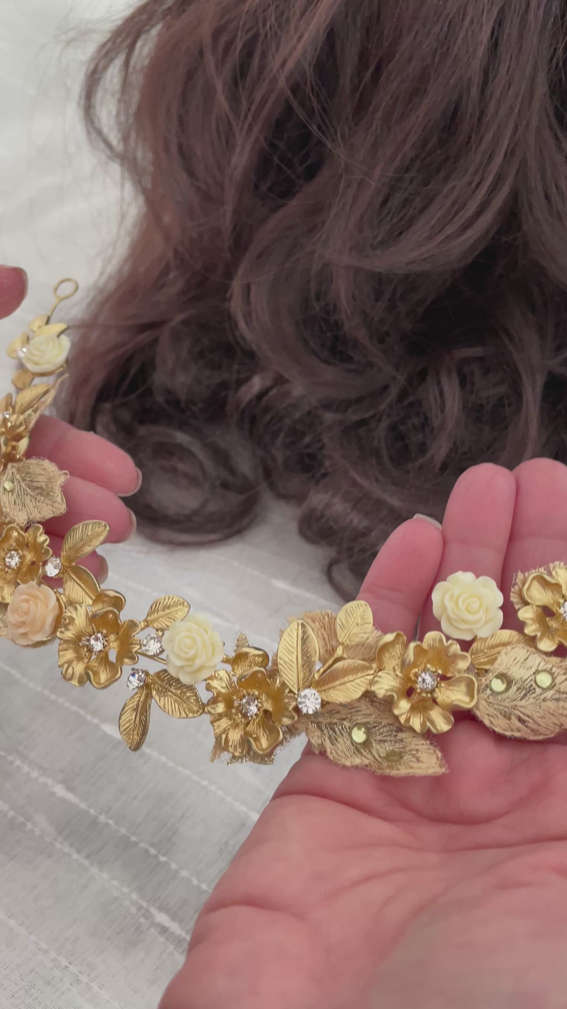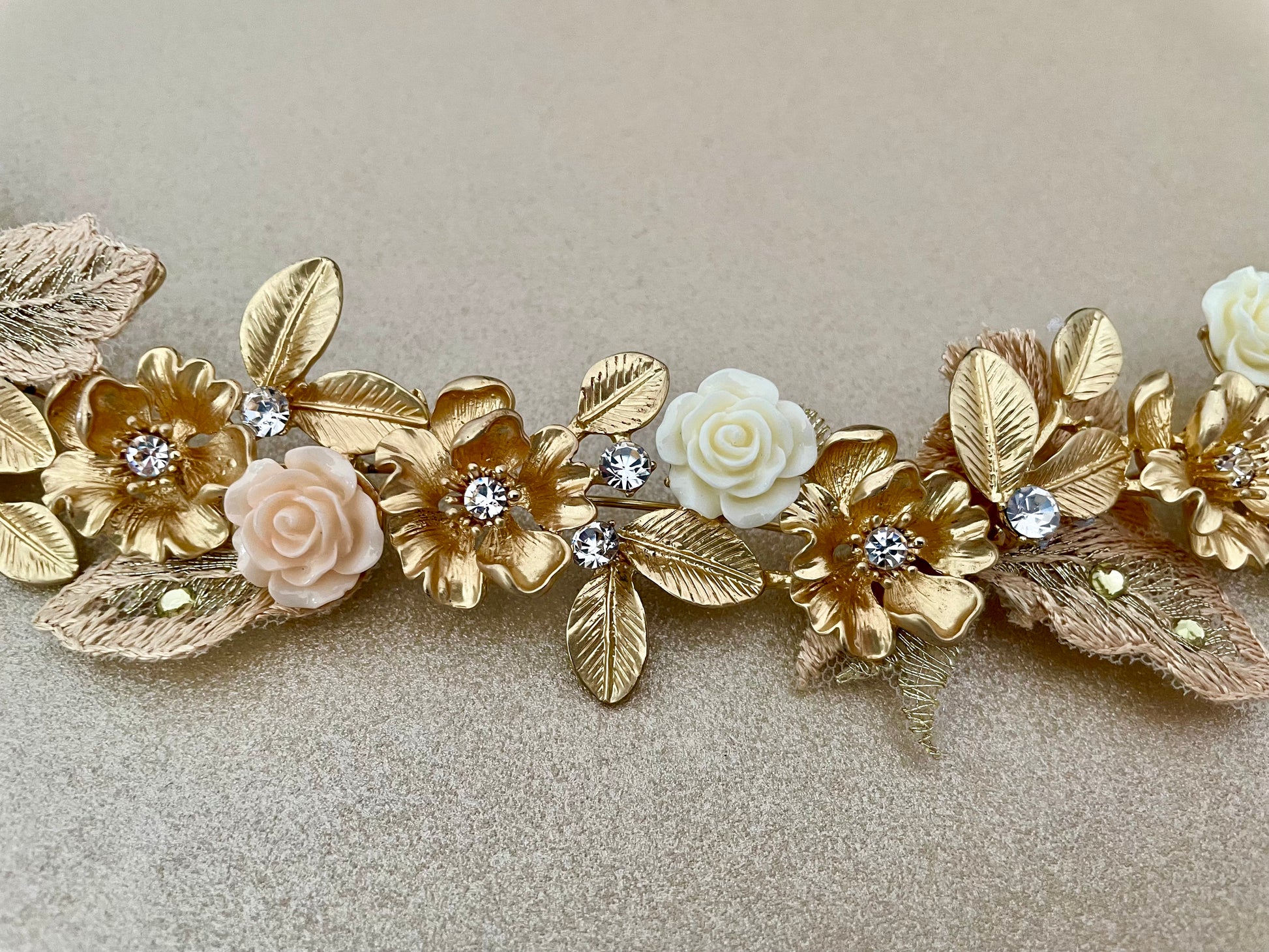 A romantic golden flower vine bridal headpiece designed with hand-crafted metal florals, soft blush and ivory resin roses, lace-textured leaves, and crystal accents. This flexible bridal hair vine curves effortlessly through updos, half-up styles, or loose waves, making it an elegant statement for classic, garden, or romantic weddings.