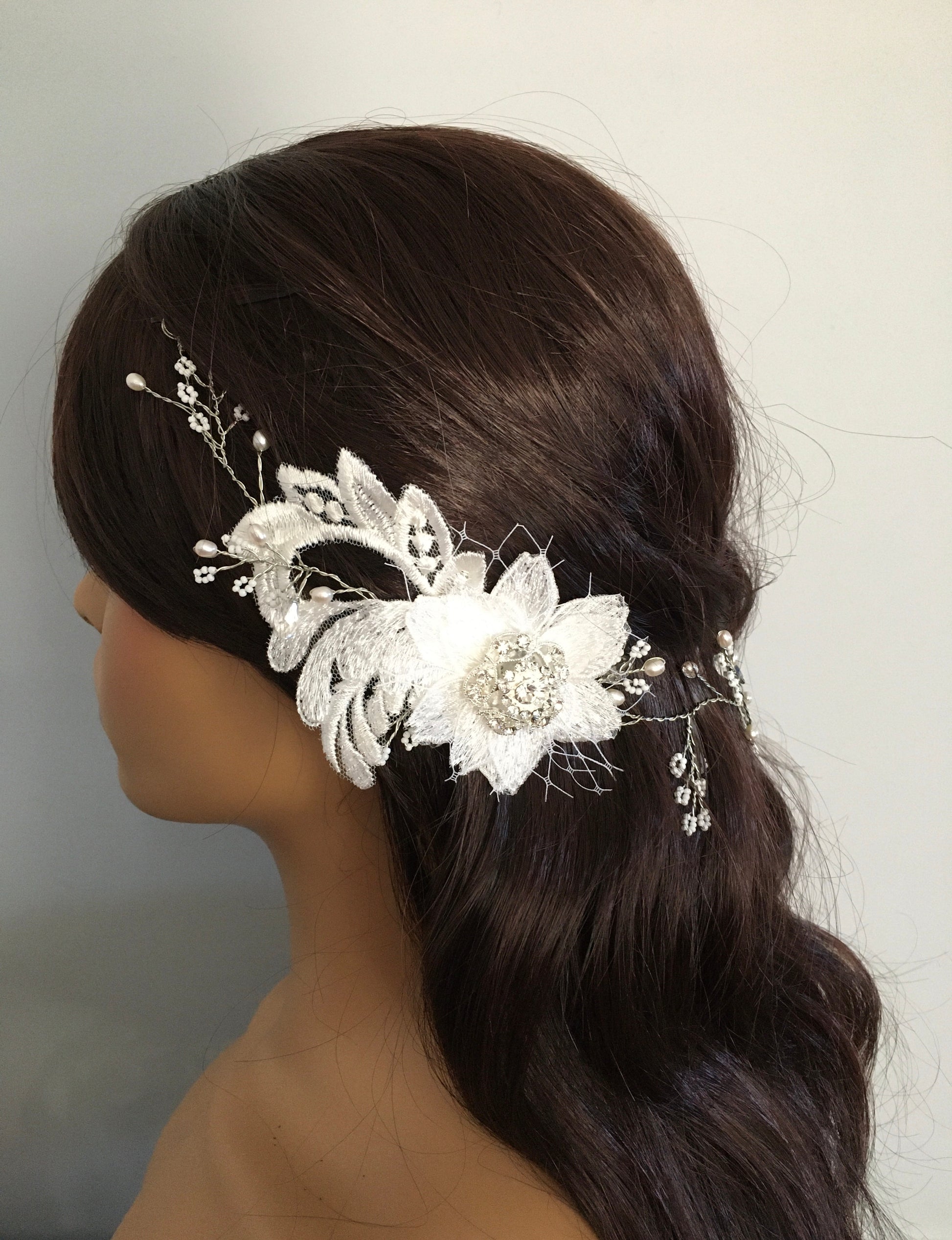 The Riviera hair vine features delicate lace leaves, luminous pearls, and sparkling crystal accents woven along a flexible vine, this piece drapes beautifully through loose waves, half-up styles, or a low chignon.