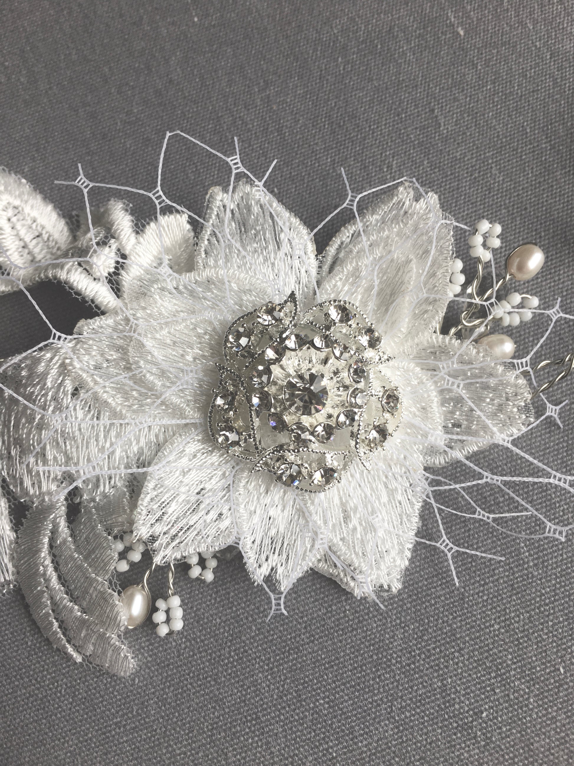 Approx. size is 19 inches x 3 inches. Loops on each side to attach to hair with pins (pins not included).